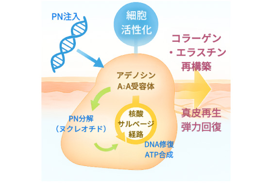肌に注入されたPNは、アデノシンA₂A受容体を刺激して細胞の働きを活性化し、肌をつくる線維芽細胞に作用してハリと弾力を支える土台を整えます。